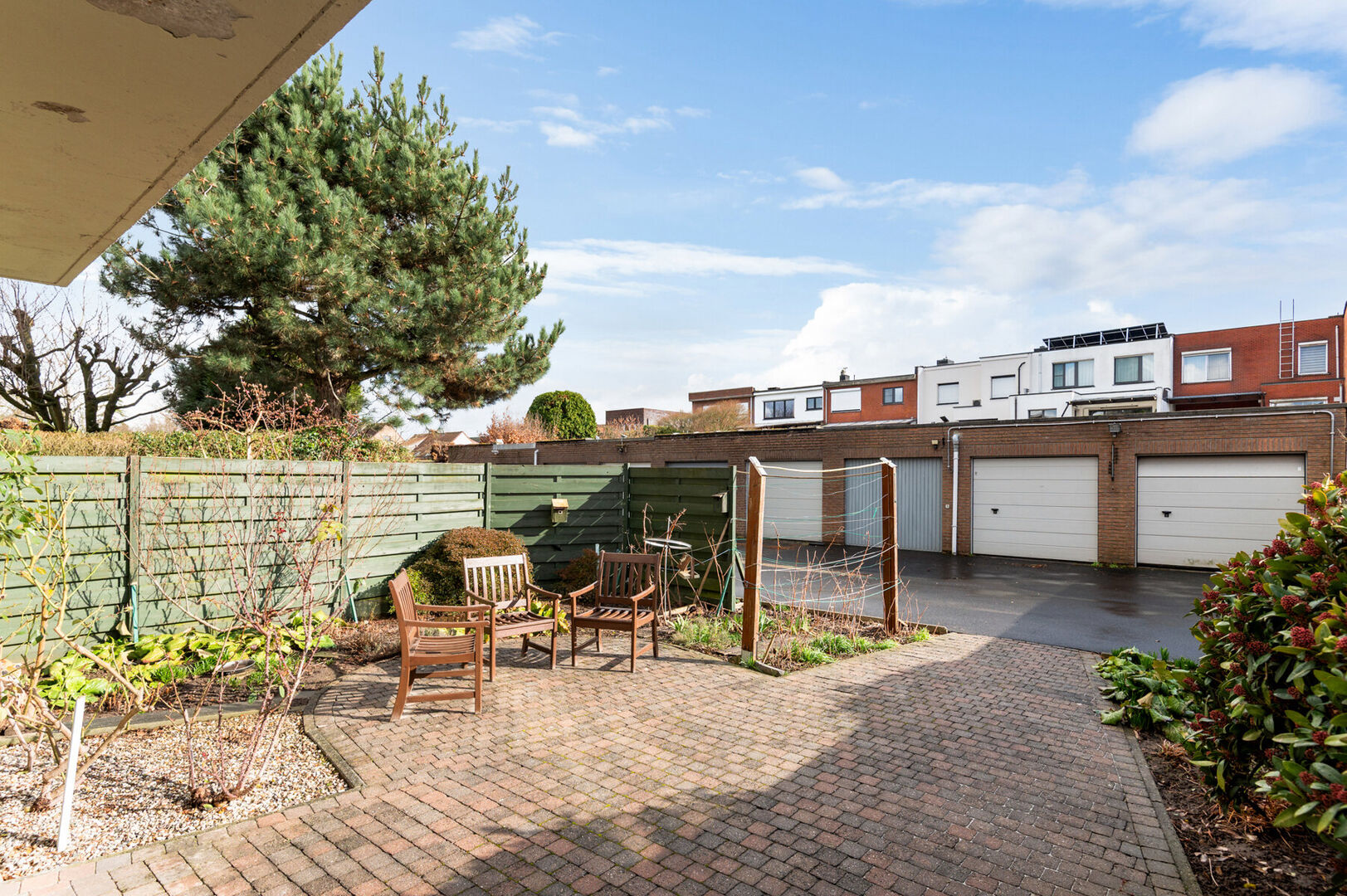 Achteraan bevindt zich een klein, gezellig tuintje waar u in alle rust kan genieten van de buitenlucht. Bovendien beschikt het appartement over een aparte garage, gelegen vlak achter het gebouw, wat zorgt voor extra comfort en opbergruimte.
