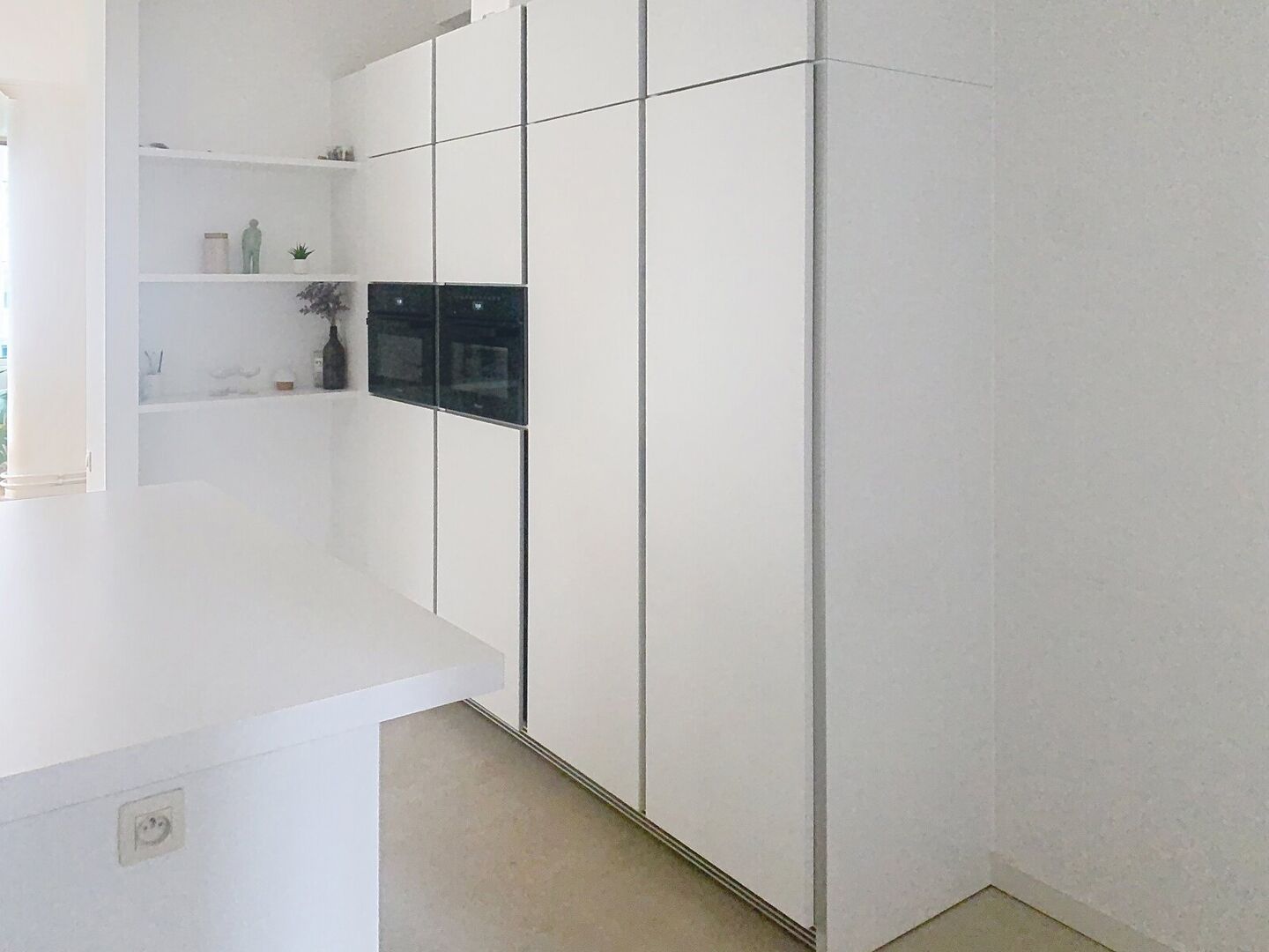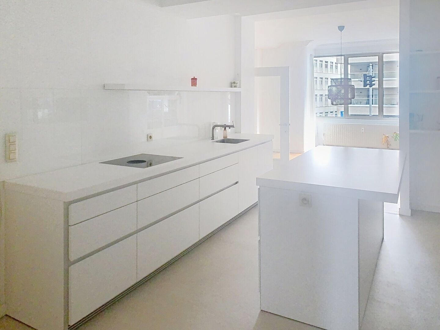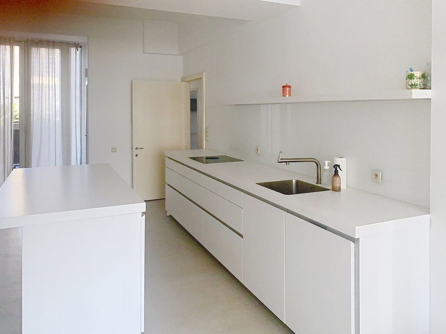De lichtrijke leefruimte grenst aan de functionele keuken met ontbijthoek en terras.