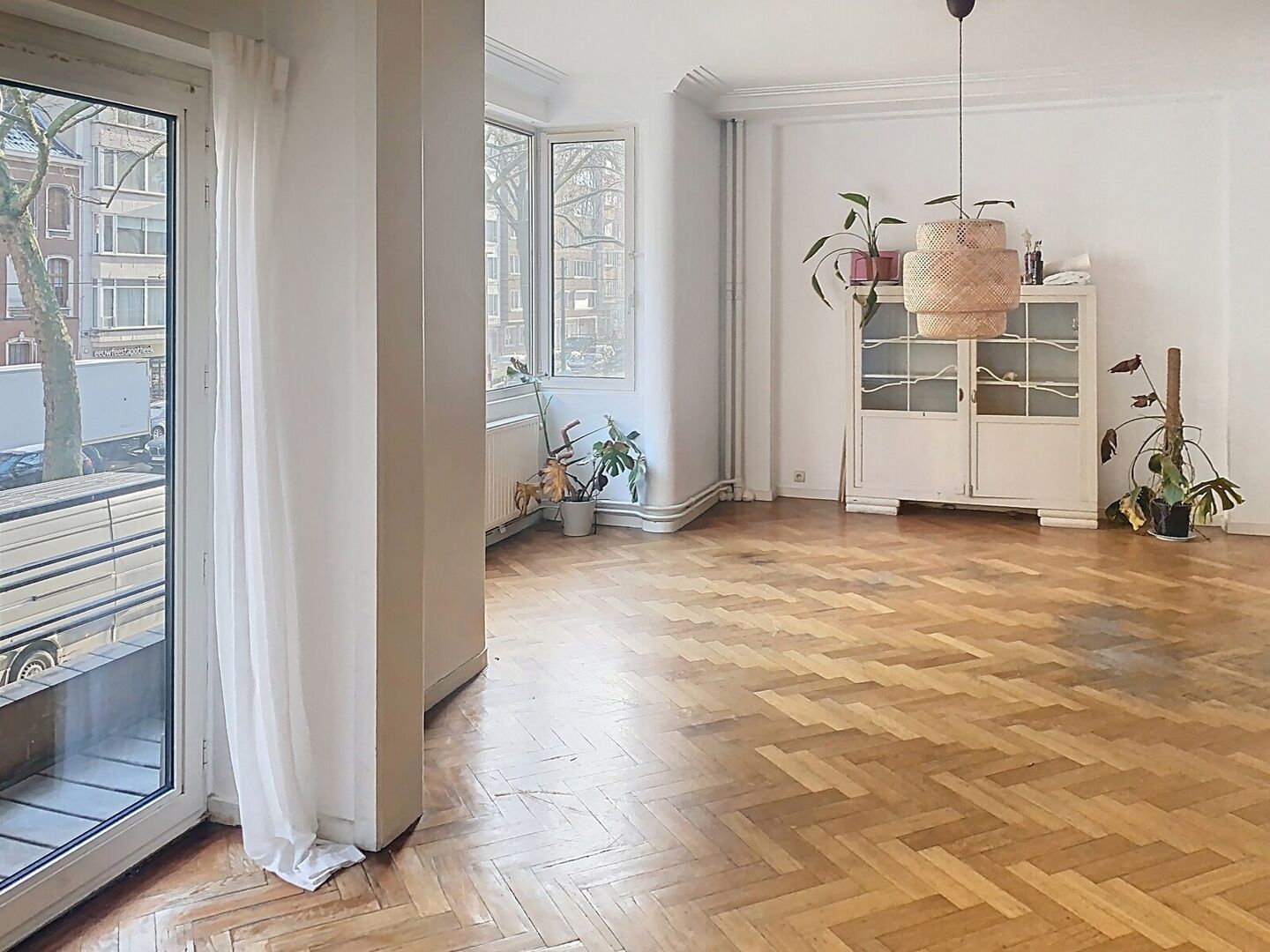 Op de eerste verdieping van dit statig gebouw tref je een ruim (163 m² - oppervlakte via EPC) appartement met twee volwaardige slaapkamers.